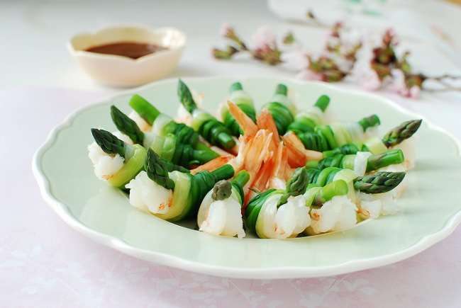Saewu Ganghwe (Spring Onion Tied Shrimp and Asparagus)