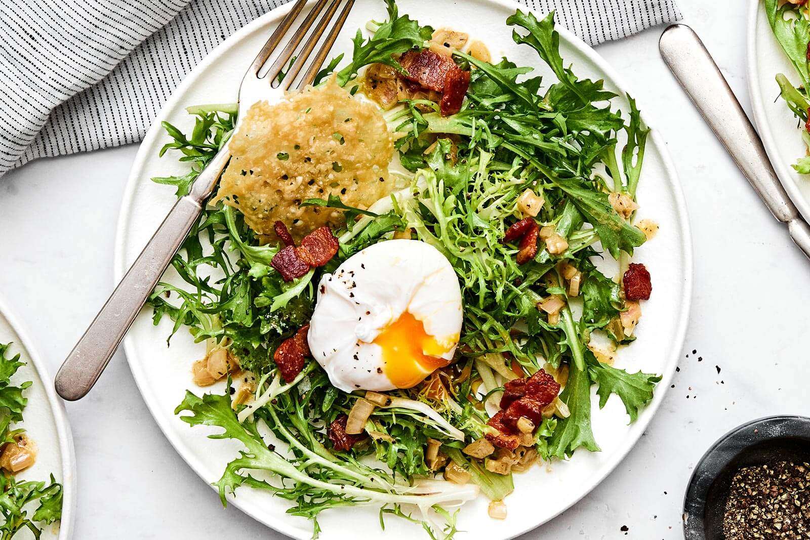 - Assemble the salad. Drizzle the warm vinaigrette over the frisée, add the crispy bacon, and use tongs to toss. Add a portion to a plate and top with a poached egg. If you'd like, add a parmesan crisp for garnish.