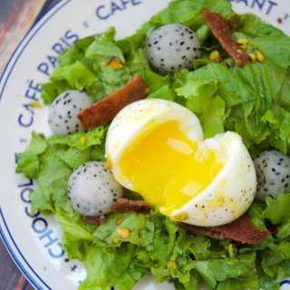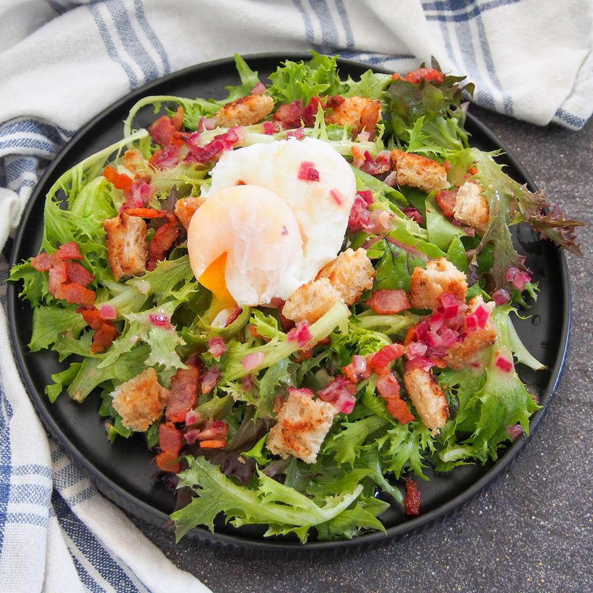 - Divide the frisée between two plates, top with the bacon pieces and add the croutons (if using) and egg on top. Drizzle over the dressing if not already mixed with the frisée, and serve.