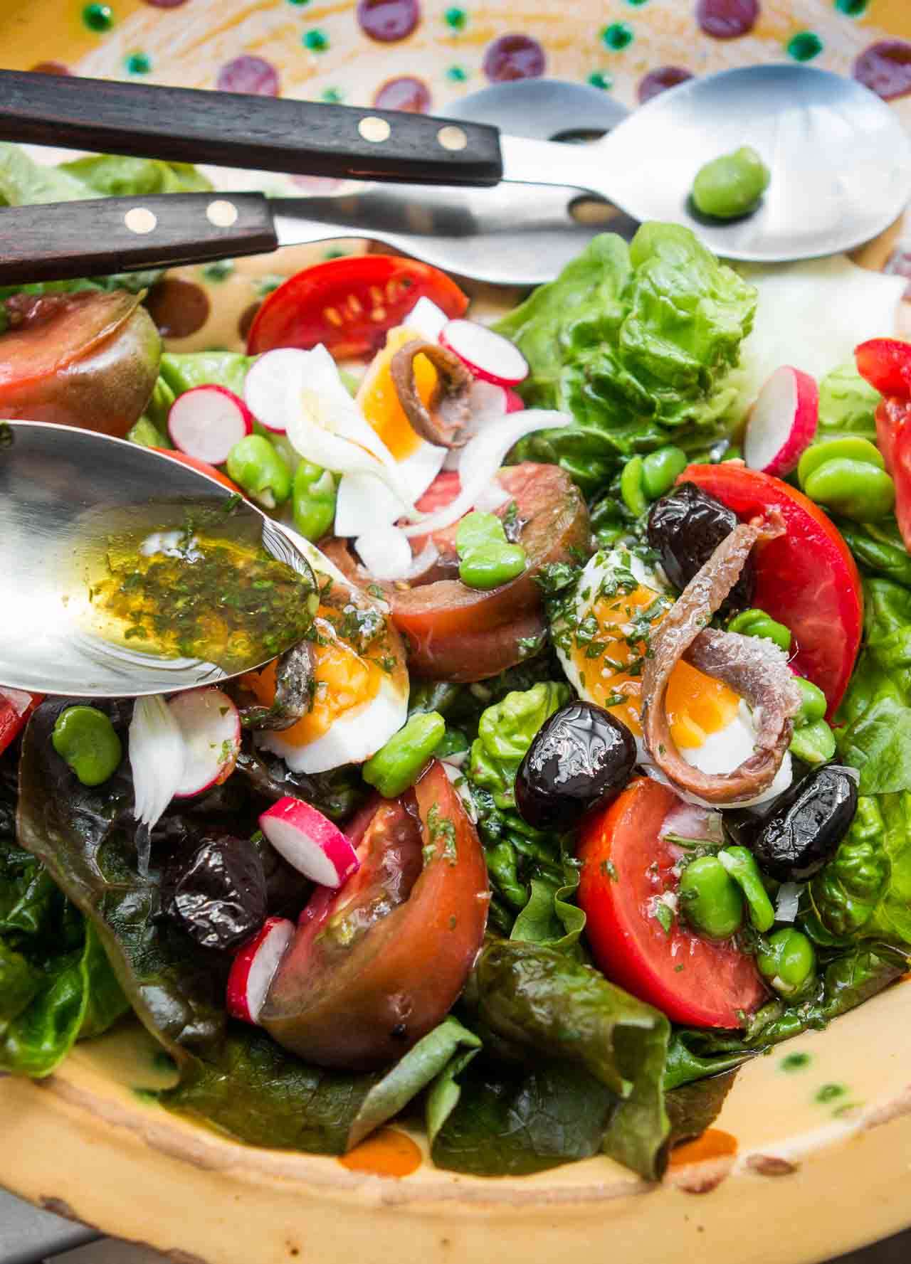 - Arrange the radishes, cucumber slices, fava beans (or artichokes), olives, quartered hard-cooked eggs, and tomatoes over the lettuce. (Drain away any liquid the tomatoes may have exuded.) Place the anchovy strips over the eggs. If using tuna, scatter big pieces or flakes over the salad.