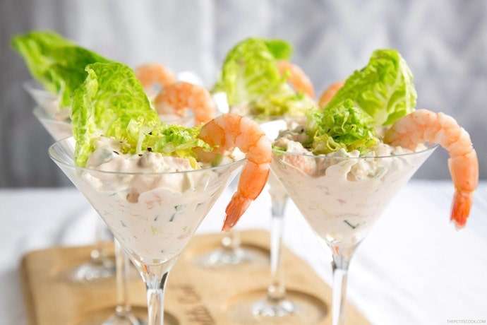 - Spoon the salmon and prawn cocktail into 4 martini glasses and decorate each one with a king prawn and a baby gem lettuce leave. sprinkle with extra black pepper and serve.