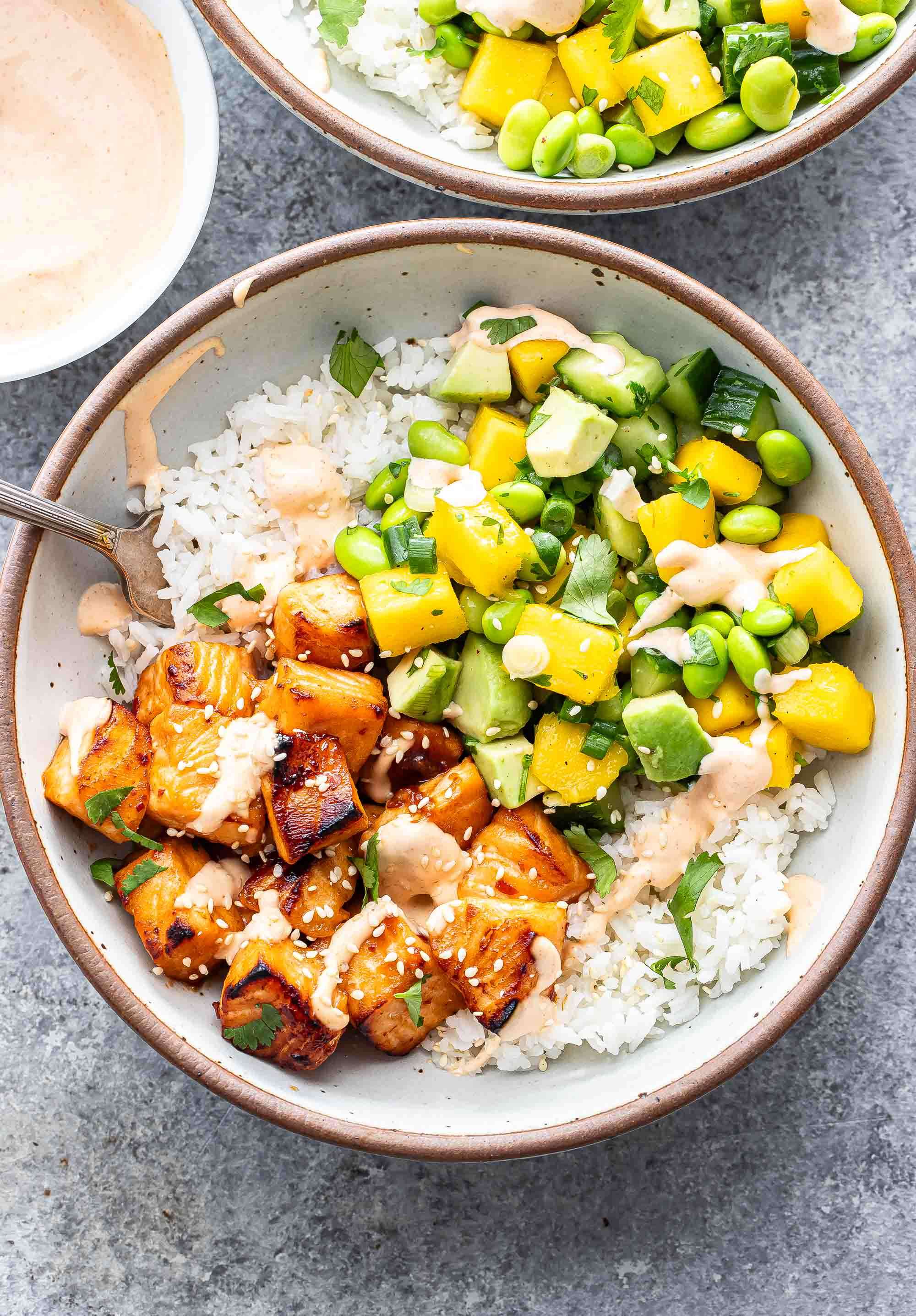- To assemble, fill a bowl with desired amount of rice and top with some of the salmon, salsa, a drizzle of sriracha mayo. Garnish with sesame seeds and cilantro.