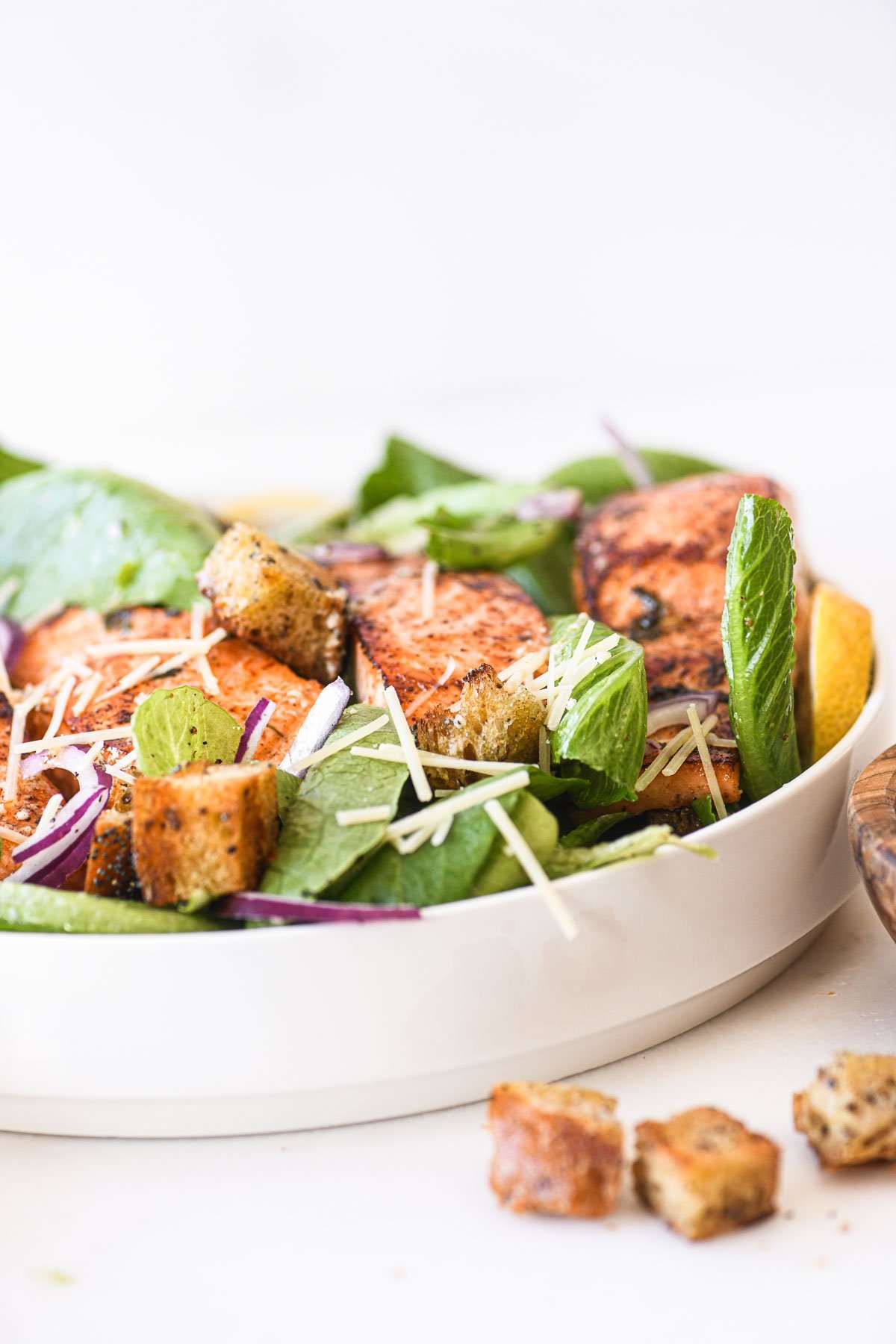 Salmon Caesar Salad with juicy pan seared salmon and tons of flavor is a satisfying main course salad to boost your healthier meal plan.