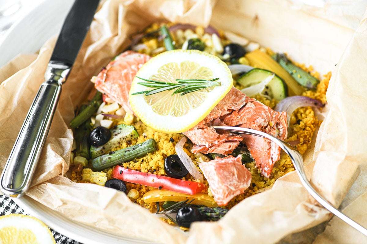 - Add the veggies and nuts on and around the couscous. Season with salt and pepper, and top with small cubes of butter (optional.) Lay salmon on top and press down slightly to level it. I like to add a lemon slice to the salmon. Season again with salt and pepper and sprinkle all with fresh rosemary. Drizzle everything generously with olive oil.