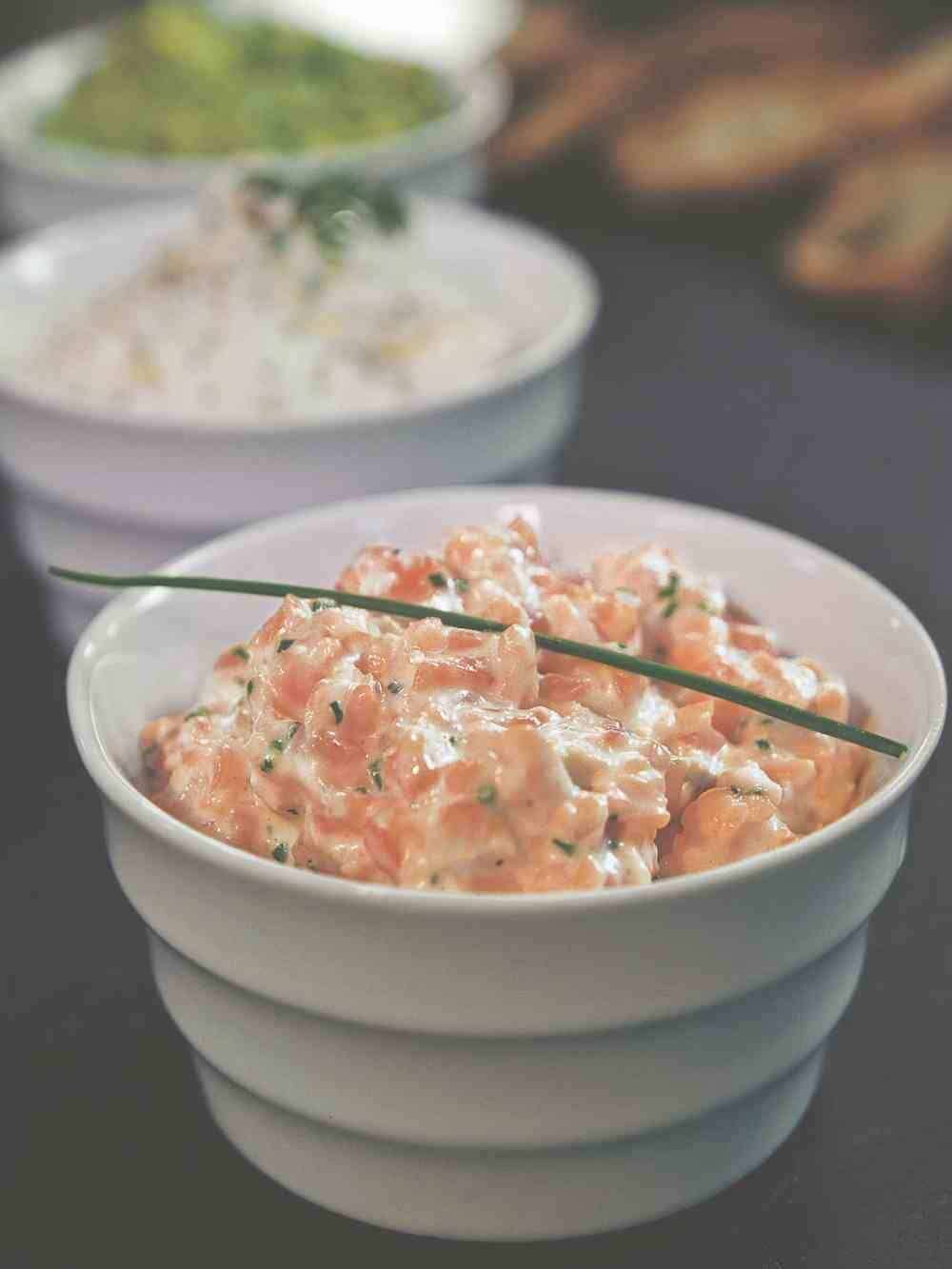 - Combine the poached salmon pieces, reserved cooked shallots, smoked salmon, chives, and some of the mayonnaise and lemon juice in a stainless steel bowl.
