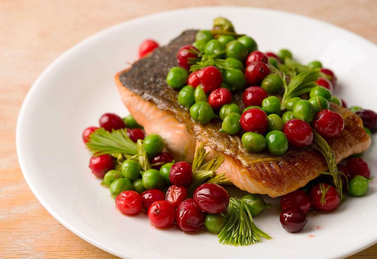 - Add the remaining tablespoon of butter and the peas. Cook for 1 minute. Add the cranberries and cook for 1 more minute. Toss to combine, turn off the heat and add the spruce tips. Put a piece of salmon on everyone's plate, pour over the pea-cranberry mixture and grind a little black pepper over it all. Serve at once.
