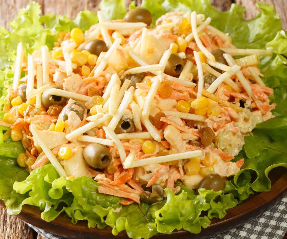 - In a bowl, combine together the shredded chicken, olives, corn, grated carrot raisins, apple and corn and stir until the mixture becomes homogenous.