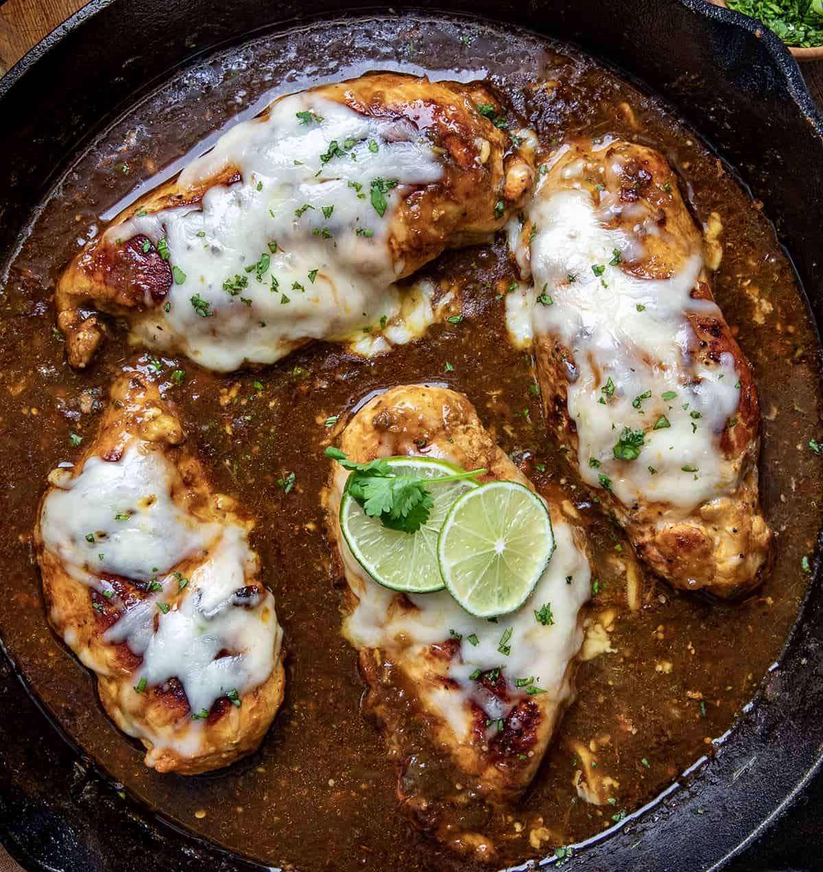 Salsa Verde Chicken is chicken breasts marinated in zesty lime and spices, cooked to perfection, then nestled in salsa verde, topped with cheese, and baked until the cheese has melted. Serve the chicken over cilantro rice for a super flavorful and satisfying meal!