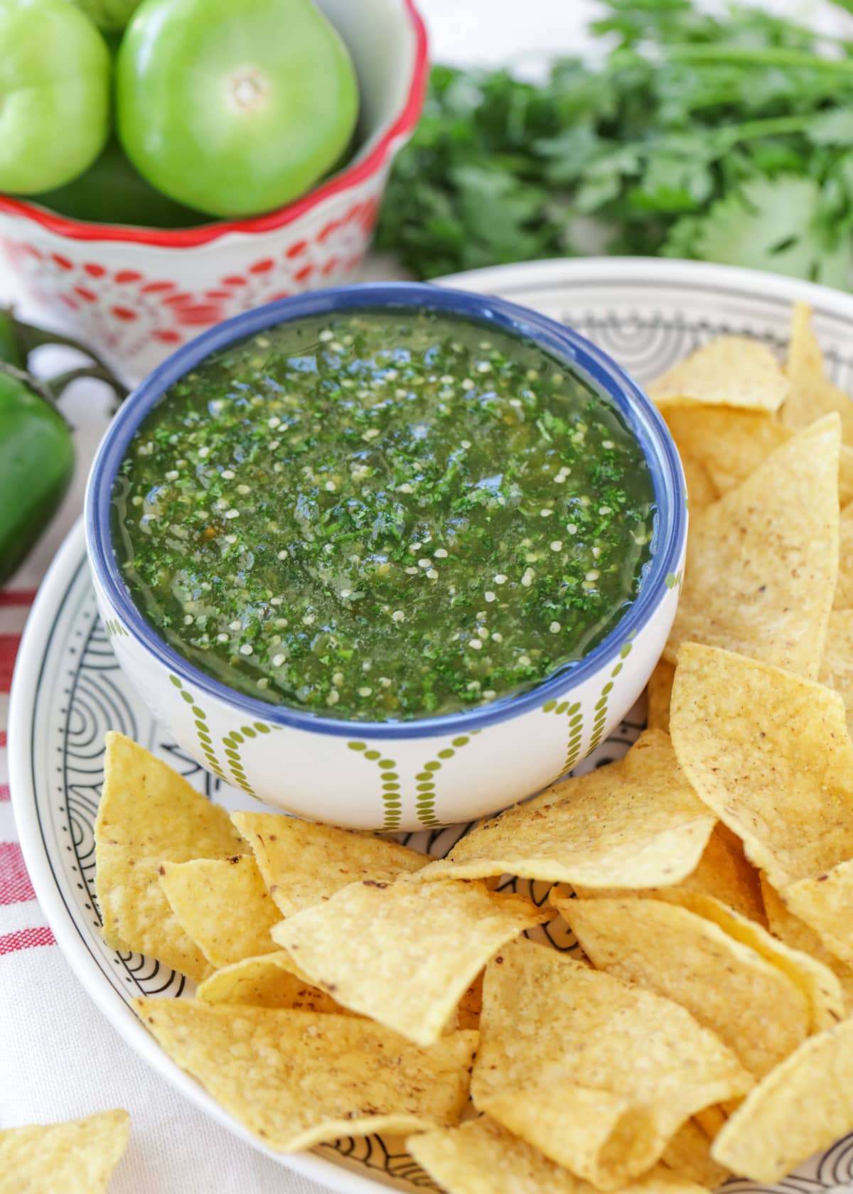 Sweet Salsa Verde - a delicious salsa recipe that is sweet and takes just minutes to make. Ingredients include tomatillos, jalapenos, sugar, & cilantro.