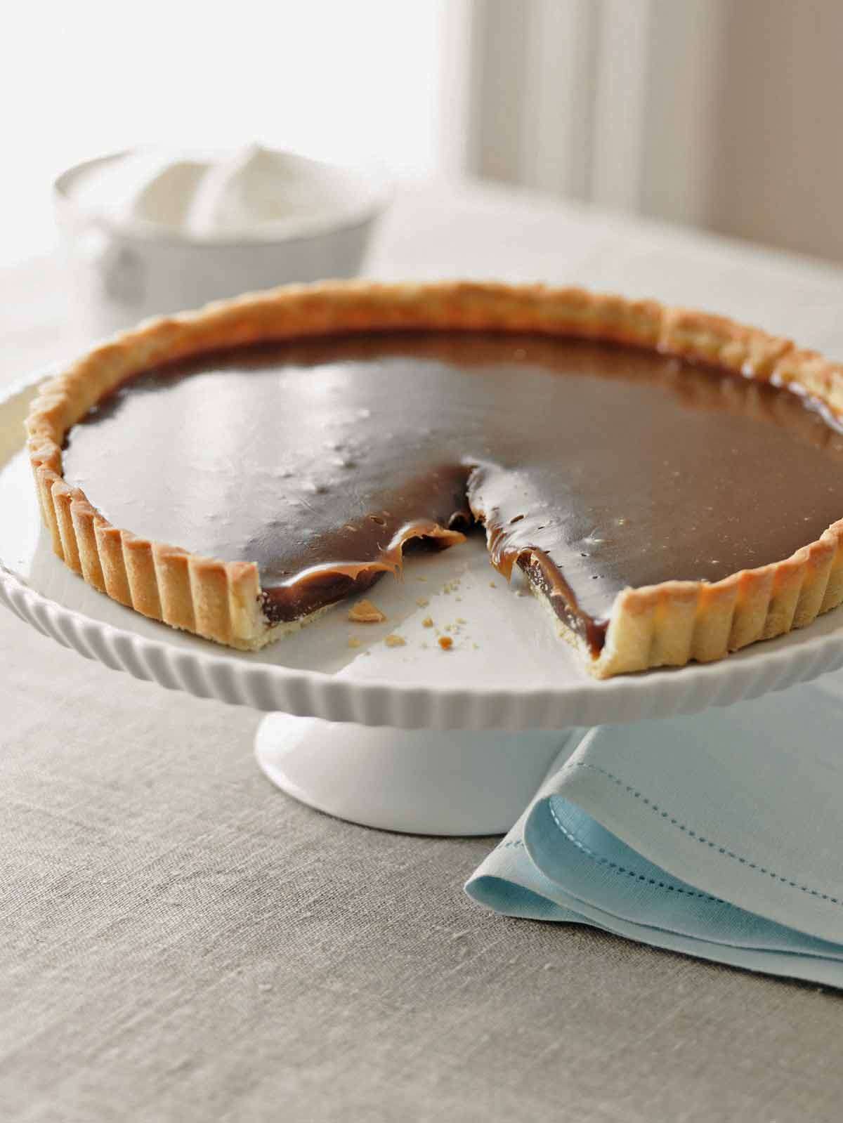 - Slowly pour the cooled caramel into the cooled, baked pastry in the tart pan. Refrigerate the tart for at least 2 hours.