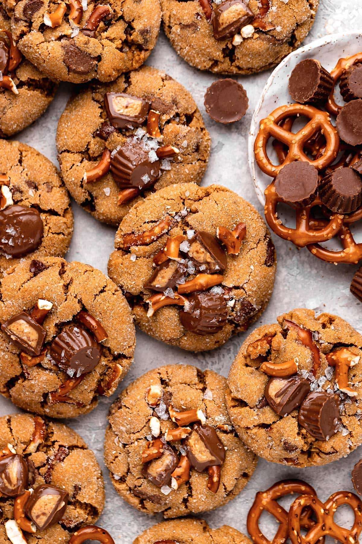 - Bake the cookies for 10 to 12 minutes or until golden brown around the edges, but still soft in the middle. Remove from the oven and sprinkle the cookies with flaky sea salt. You can also gently press additional pretzels and mini peanut butter cups on top for looks, if desired. Let the cookies cool on the baking sheet for 5 minutes. Transfer to a cooling rack and cool completely.