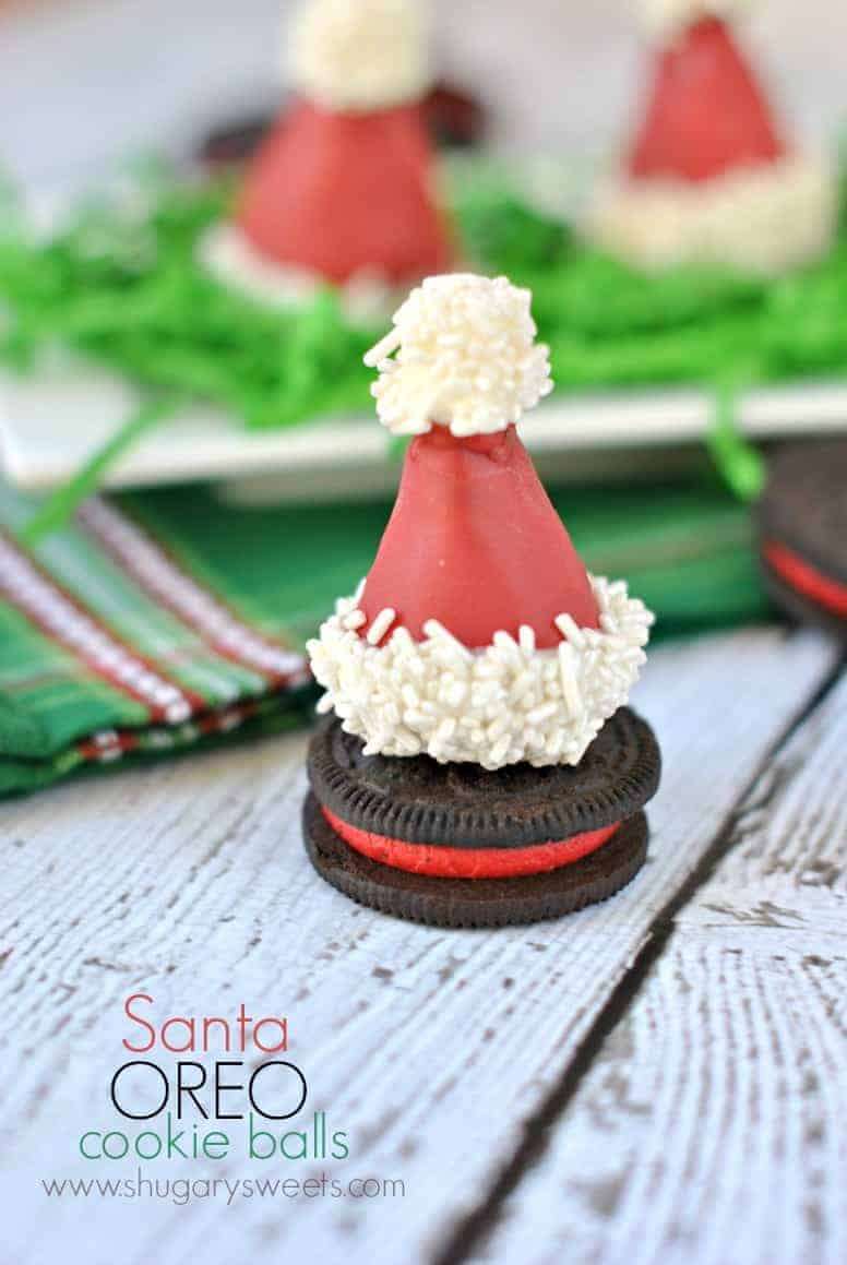 - Scoop cookie balls with a 1 Tbsp cookie scoop, or a heaping tablespoon of dough. Using your hands, roll into a ball (will be about 1 inch). Pinch the top of the ball and shape until you have a cone, that resembles a Santa hat. Repeat until all dough is used.