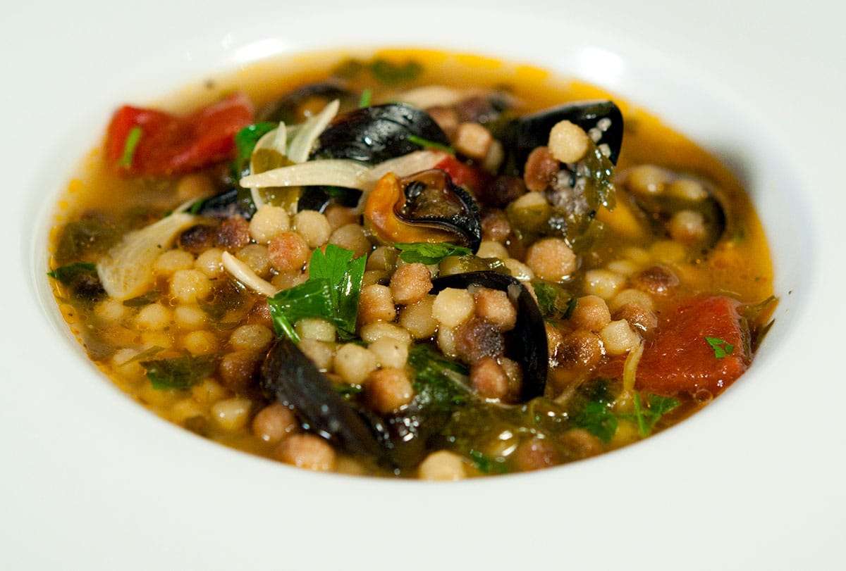 - In a large soup pot, heat the olive oil over medium-high heat and saute the garlic for a minute or so. Add the cayenne, parsley, stock and shellfish broth and mix to combine. Bring it to a boil and add the fregula pasta. Simmer this until the pasta is nearly done, about 10 minutes.