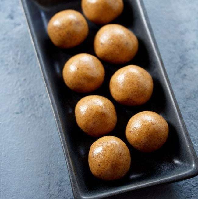- Shape into ladoo while the mixture is still warm. If you are unable to form ladoo, then add a few teaspoons more of the ghee.
