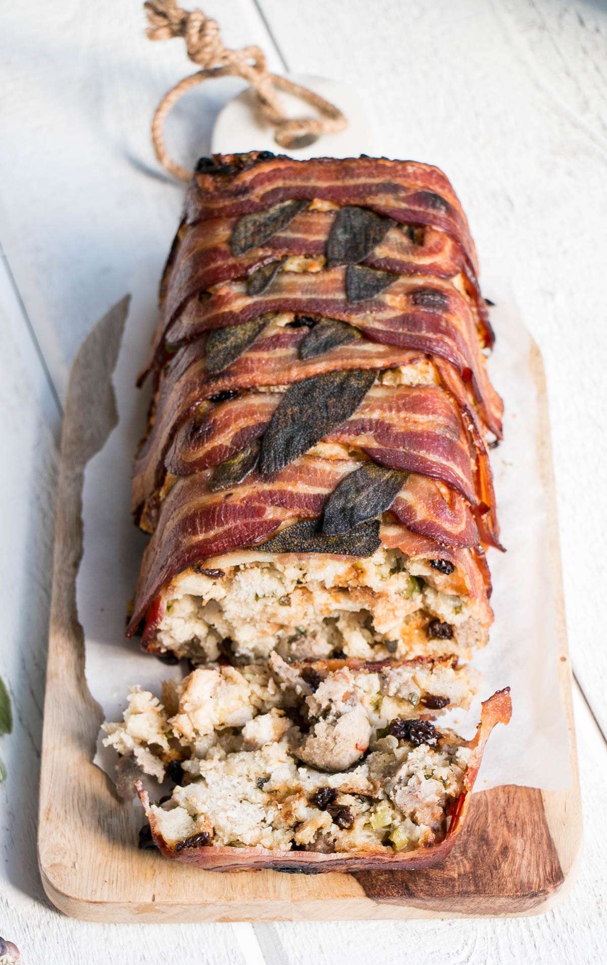 This show-stopping stuffing recipe has currents and sausage, then wrapped in bacon and sage and Brussels Sprouts get a full overhaul gratin style.