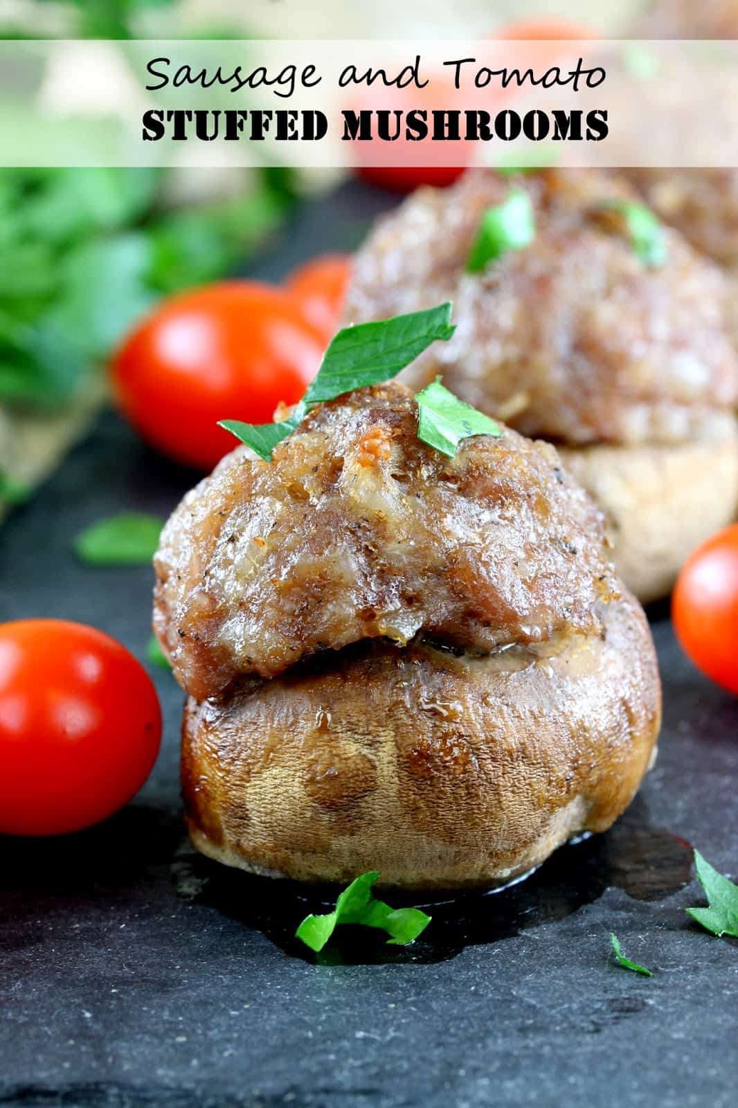 - Break off a small ping-pong sized ball of sausage and wrap it around a cherry tomato. Stuff the sausage into the mushrooms.