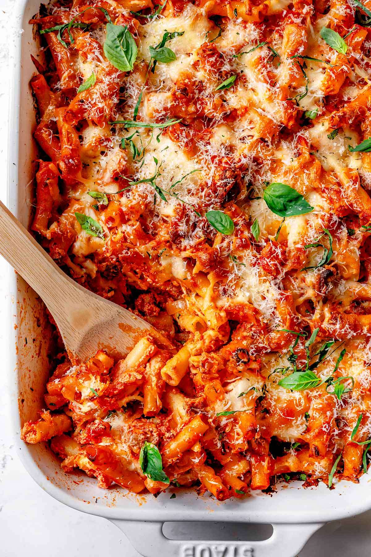 Golden and crusty on top and gooey in the middle, digging into this baked ziti reveals sumptuous layers of pasta, meat sauce, and cheese.