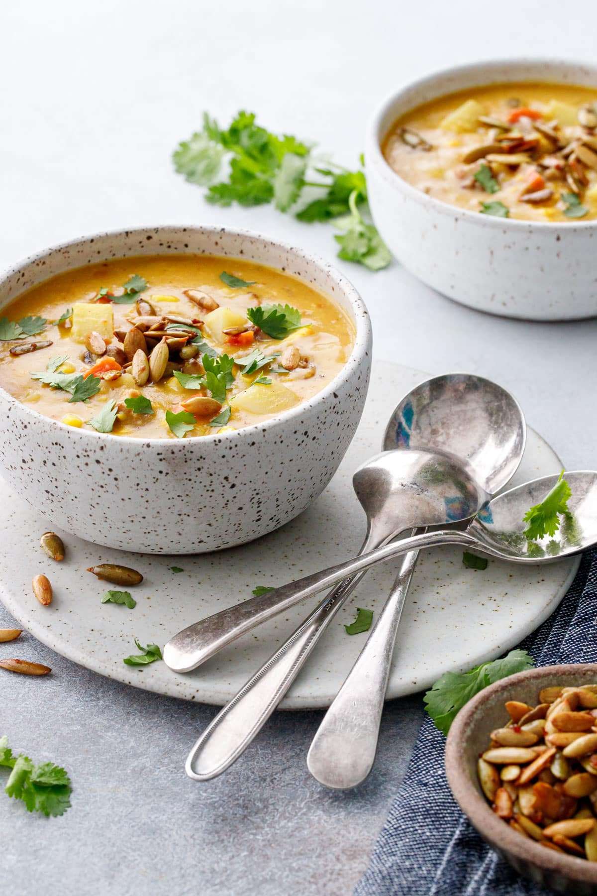 This hearty corn chowder features flavorful Italian sausage, sweet corn, and tender potatoes in a thick and creamy base, topped with some sweet and salty pepitas for the perfect finishing crunch.