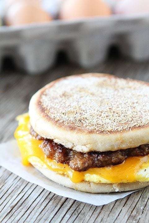 - 4. To assemble: Spread 1 tablespoon of maple butter on English Muffin, both halves. Place 1 egg on the bottom of a English muffin then top with cooked sausage patty and slice of cheese. Microwave for 20-30 seconds to melt cheese then cap with English muffin top. Continue making other sandwiches. Serve immediately.
