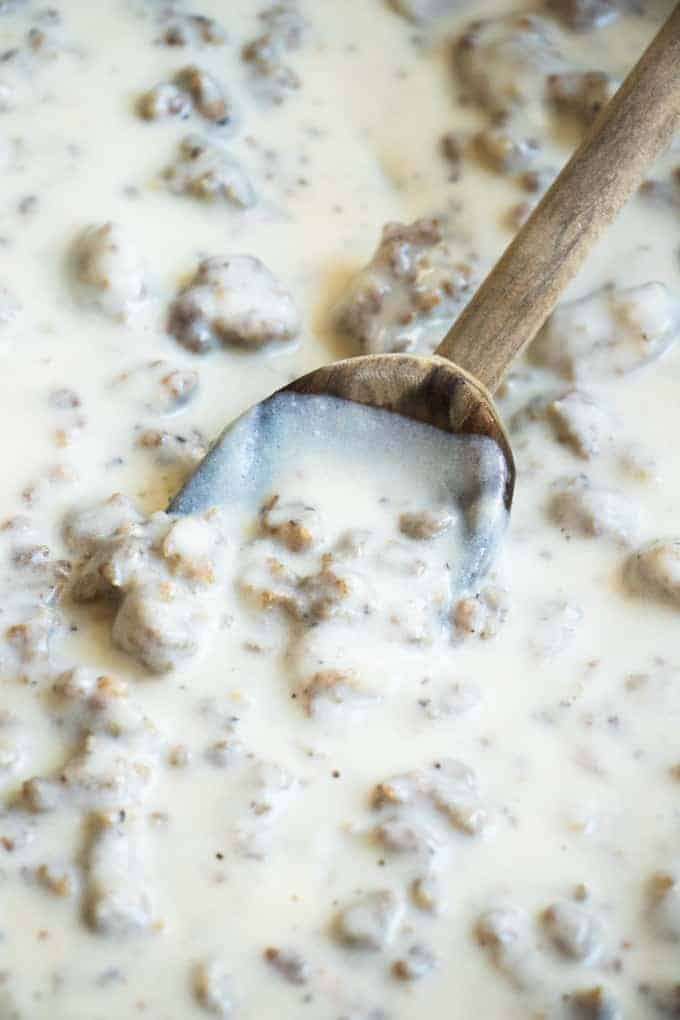 Sausage Gravy! This sausage gravy, also known as sawmill gravy, is beyond easy to make! Needing less than a handful of ingredients, this hearty, comforting recipe comes together in just minutes.