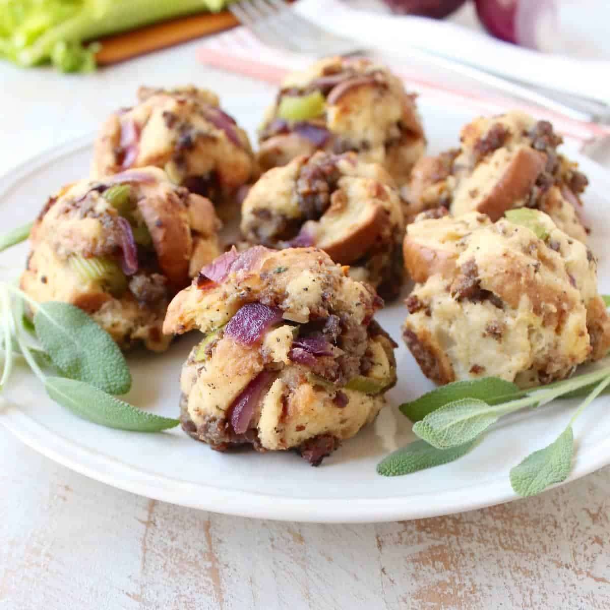 Sausage, potato bread, celery & sage are combined for a little taste of Thanksgiving all rolled up in these easy Sausage Stuffing Balls, perfect as a side dish or party appetizer!