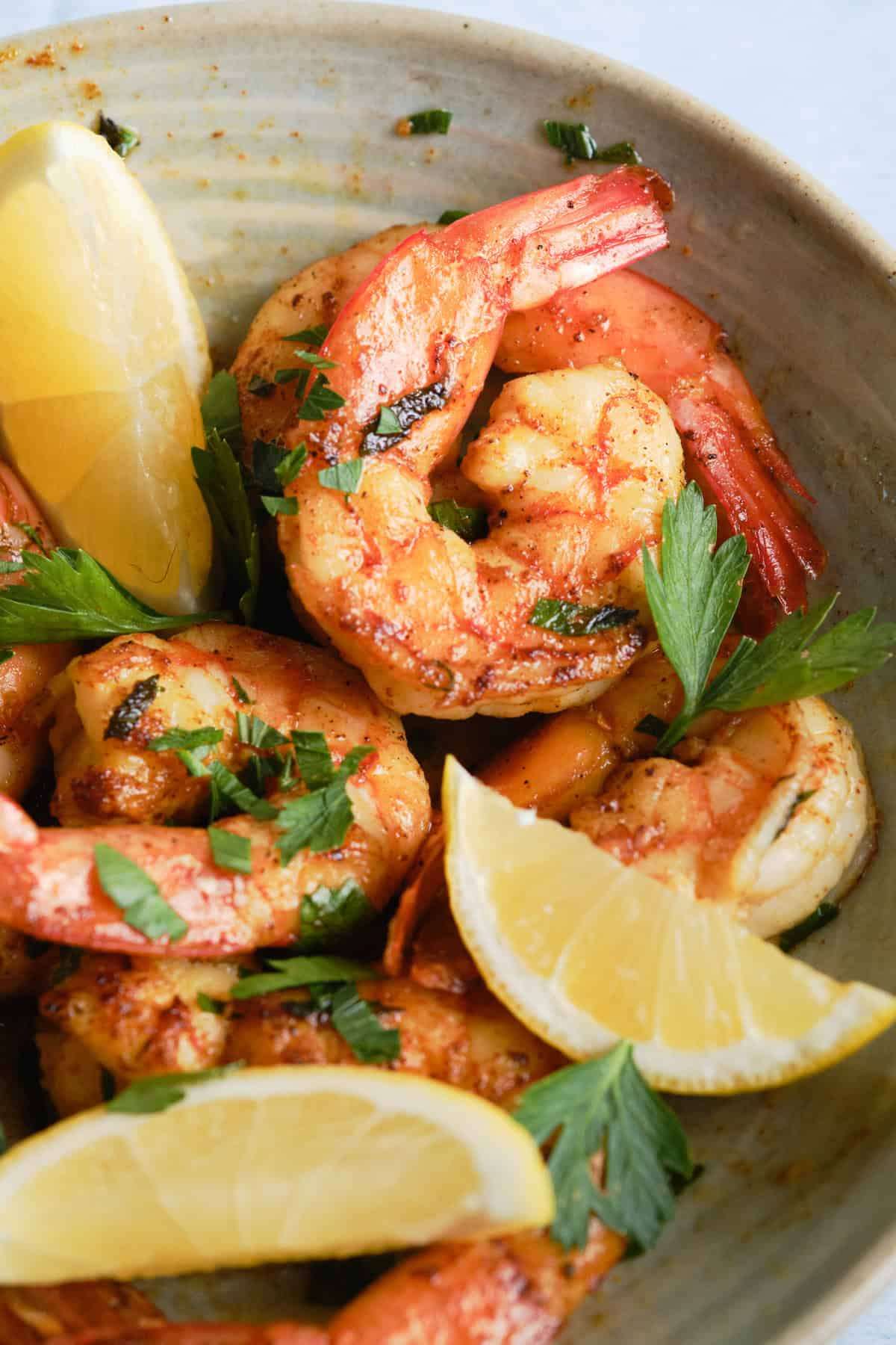 - Transfer the sauteed shrimp to a plate and garnish with lemon wedges and parsley. Enjoy!