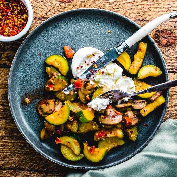 Easy Italian side dish of garlic sauteed zucchini and mushrooms topped with delicious burrata cheese.