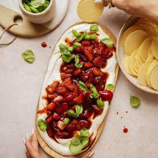 - Spread ½ cup of the yogurt mixture in the bottom of a plate. Add roasted chickpeas, however many you like. Add the chopped tomatoes, zucchini ribbons, handful of fresh herbs, jammy eggs (cut in half) and drizzle over chili oil or chili flakes and olive oil. Add a big pinch of salt and pepper and enjoy!
