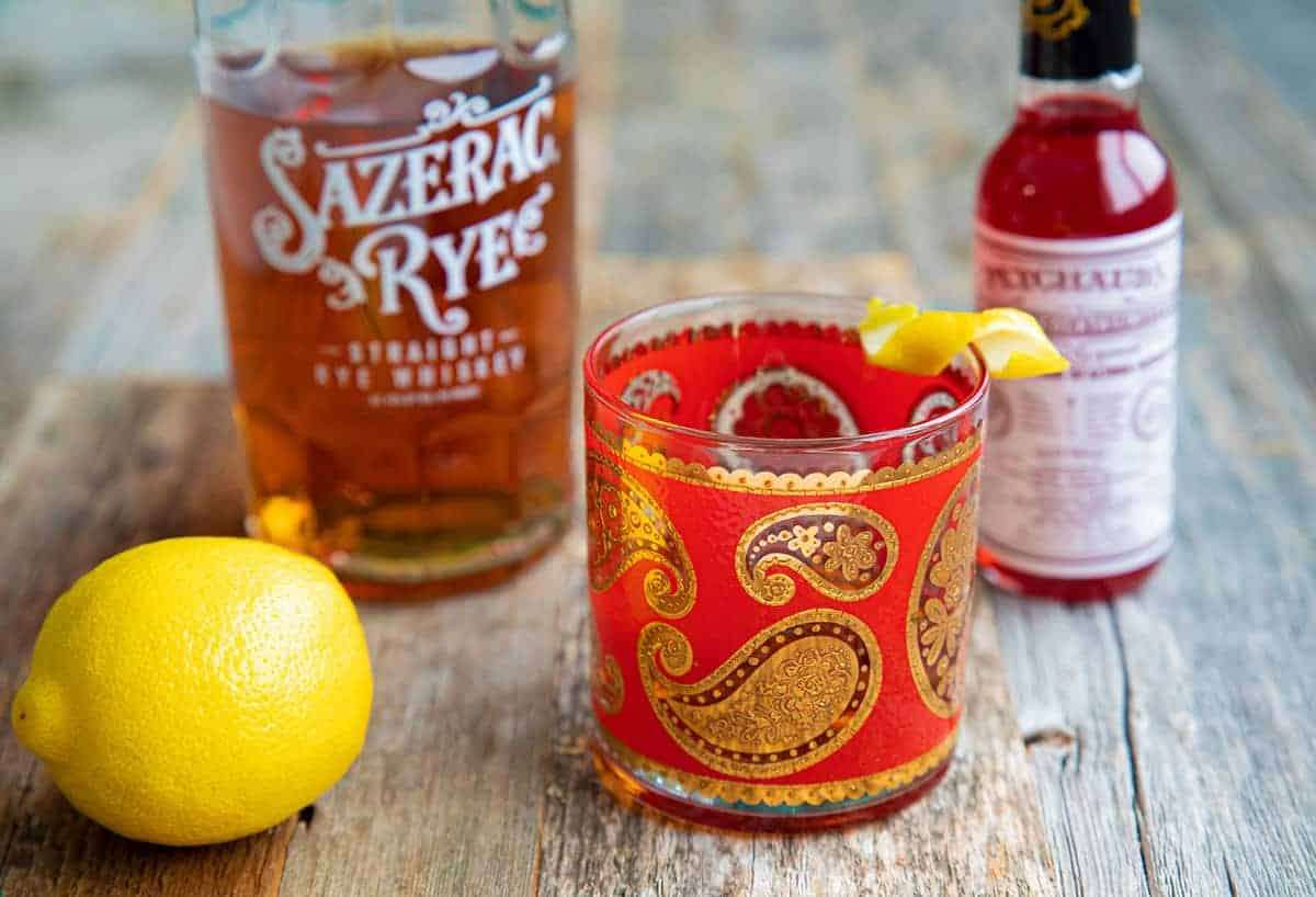 - In a mixing glass, add 2 dashes of Peychaud’s bitters and a sugar cube. Muddle the cube and add in the whiskey or cognac and stir.