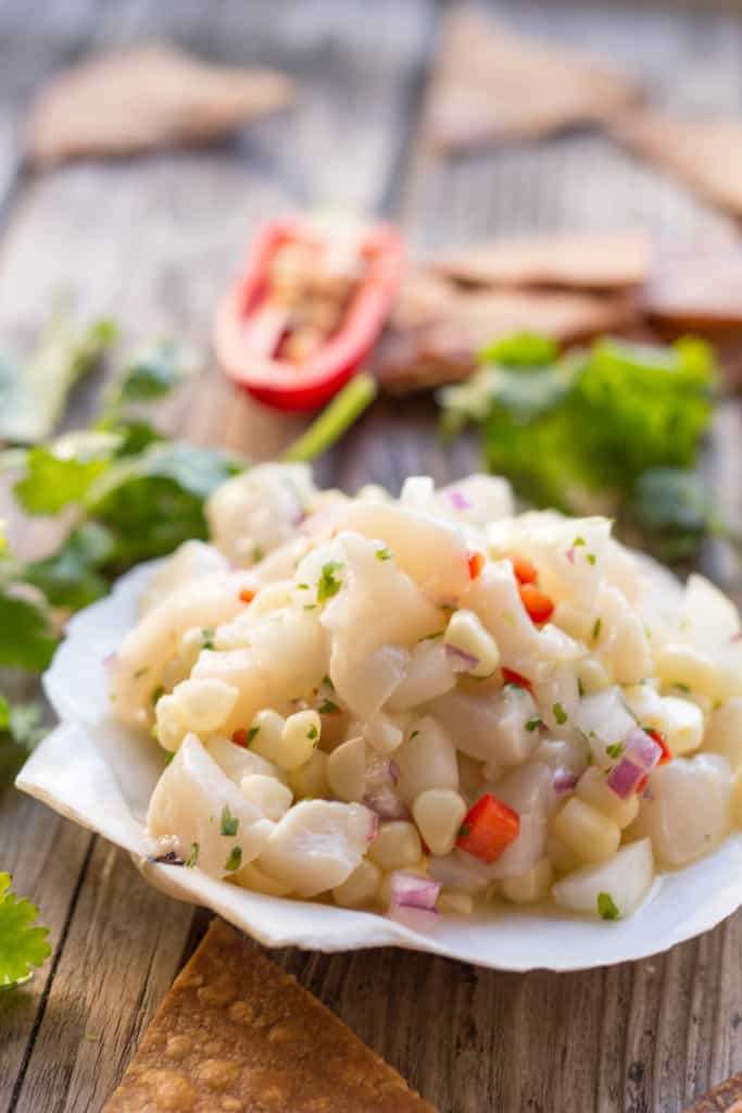 This scallop ceviche with corn and cucumber is a light and refreshing recipe perfect for summer entertaining! Serve it with tortilla chips and cocktails!