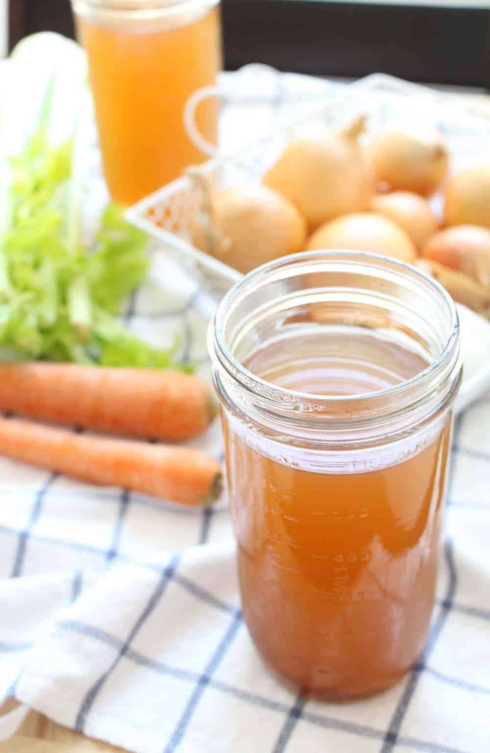 It's easy to make homemade vegetable broth (or stock) for FREE using scraps from veggies like onions, carrots, and celery, kept in the freezer until you're ready to make it!