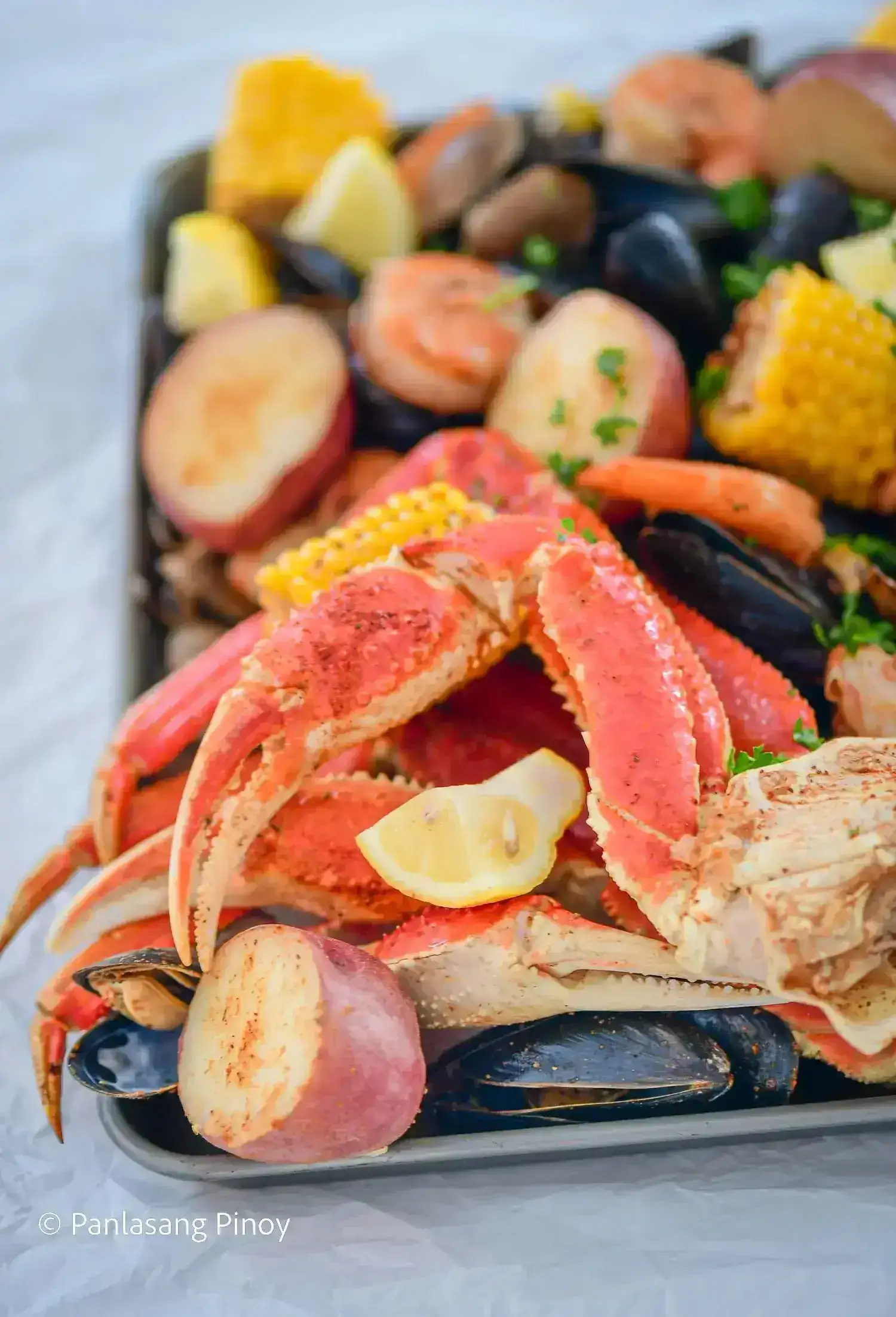 - Remove the seafood along with the potatoes and corn from the pot. Let the water drip.
