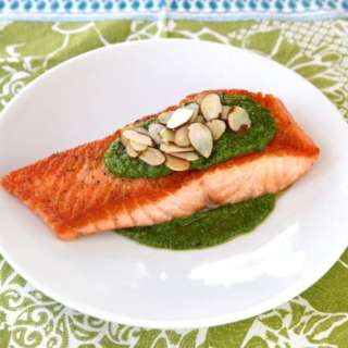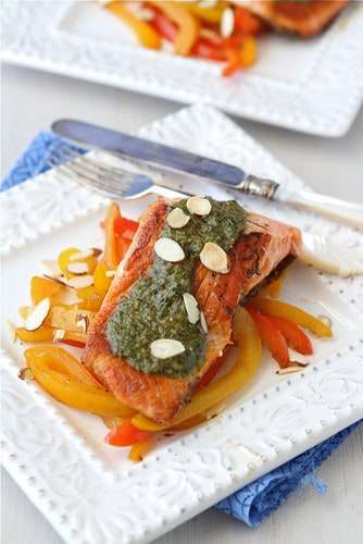 Seared Salmon with Pesto, Sauteed Peppers & Toasted Almonds
