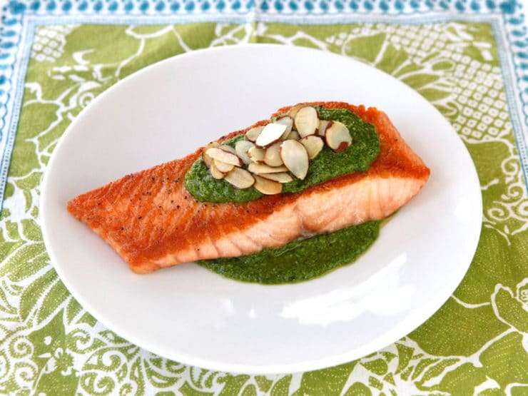 Seared salmon with a golden crust, topped with creamy dairy-free basil toasted almond pesto made with Meyer lemon juice. Kosher for Passover.