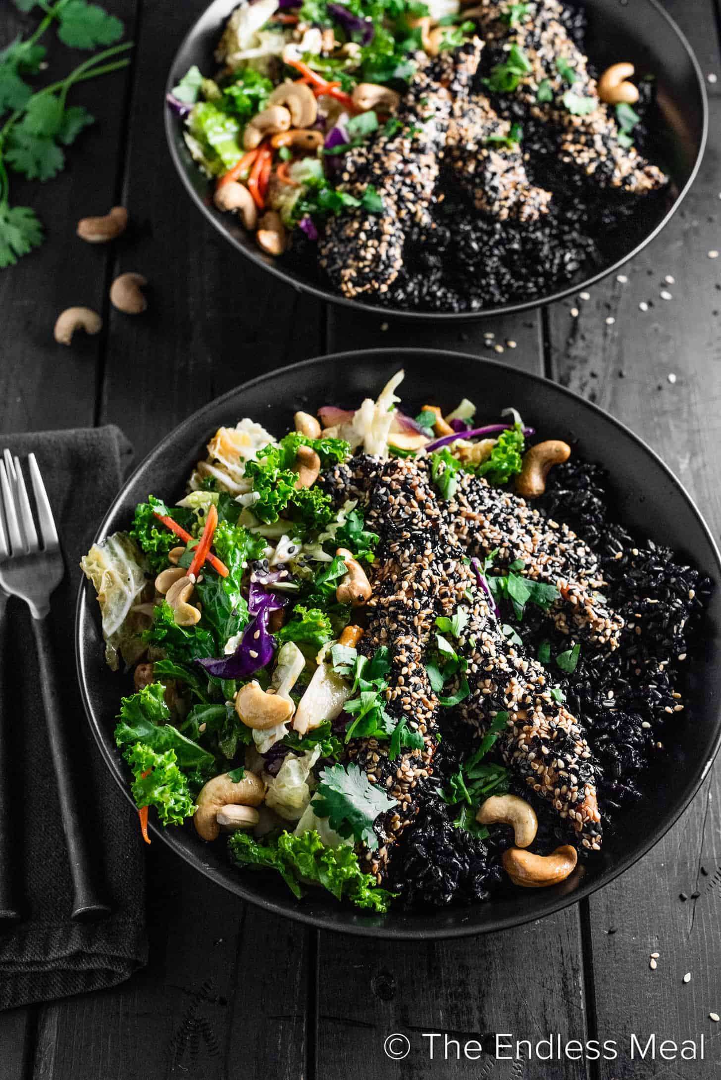 These sesame chicken bowls are a quick and healthy Asian-inspired meal. Tender baked chicken is sprinkled with sesame seeds and served bowl-style over rice and salad. It's great for meal-prepping or busy weeknights, and it's ready in just 25 minutes!