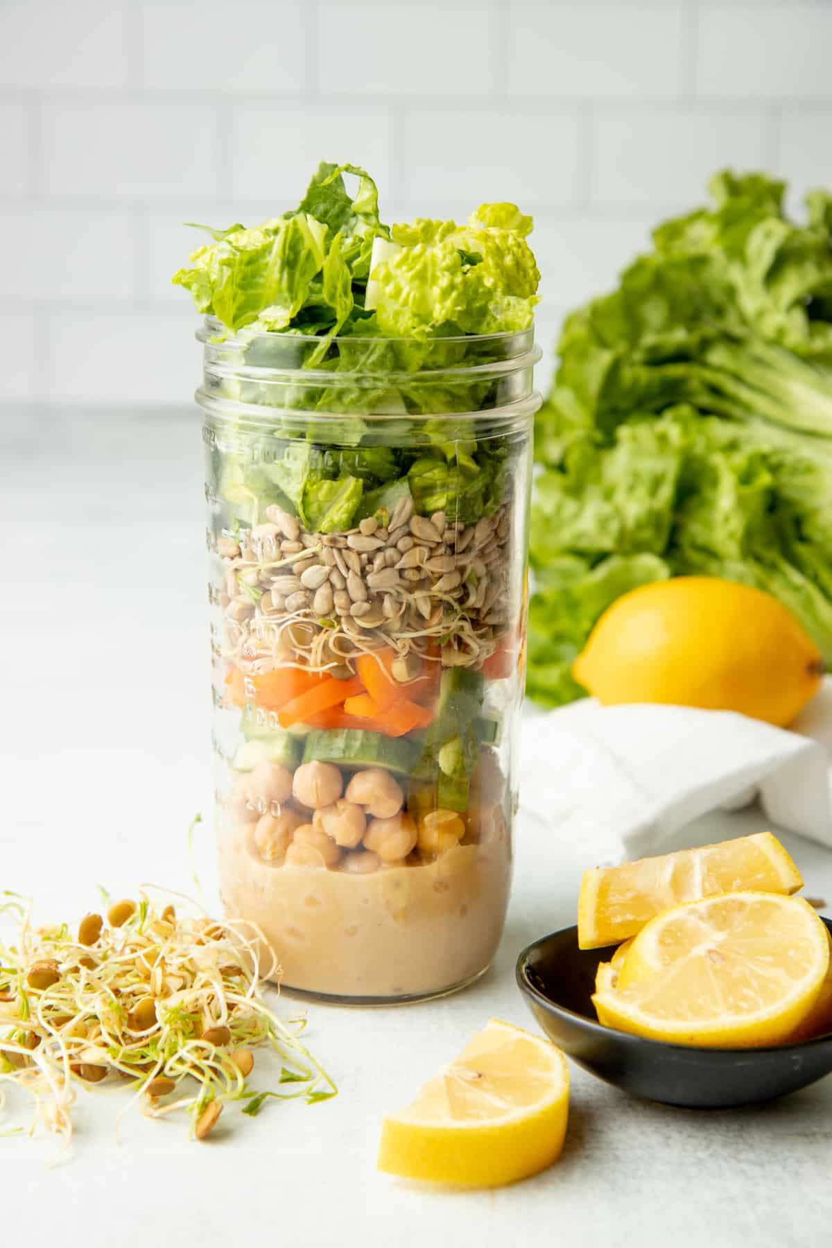 - To make the salad, layer the salad ingredients in the order listed into the jar, packing in as much romaine as you need to create a tight pack. Cover the jar, and place it in the fridge for up to a week.