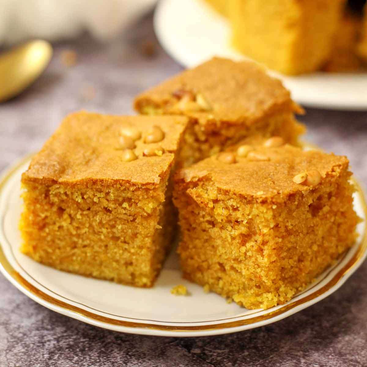 El sfouf es un pastel tradicional libanés de almendra y sémola aromatizado con cúrcuma, tahina, anís y piñones.