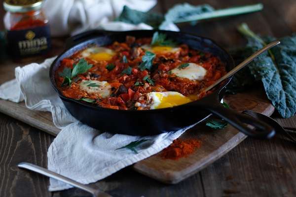 - Dig small wells into the shakshouka and carefully crack eggs into them.