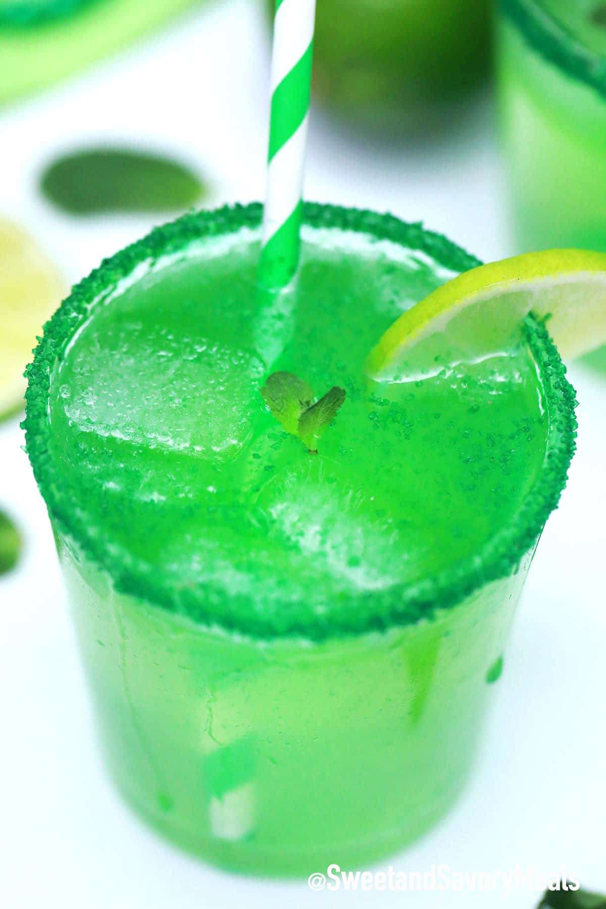 - Rub the rim of the glasses with the lime wedge. Dip in green sprinkles or green sanding sugar and set aside to chill for 20 mins.