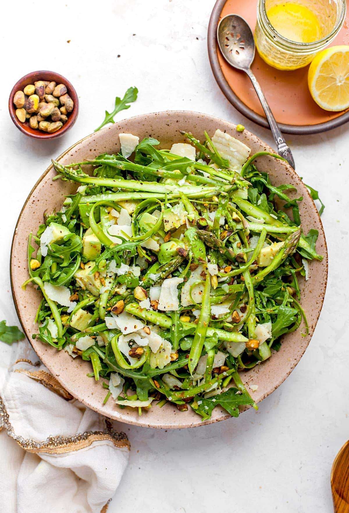 - Add the arugula to the bowl. Toss the shaved asparagus and arugula together. Add the avocado, shaved Parmesan cheese, and pistachios. Drizzle desired amount of dressing over the salad and gently toss. Season with salt and pepper, to taste. Serve the salad immediately.
