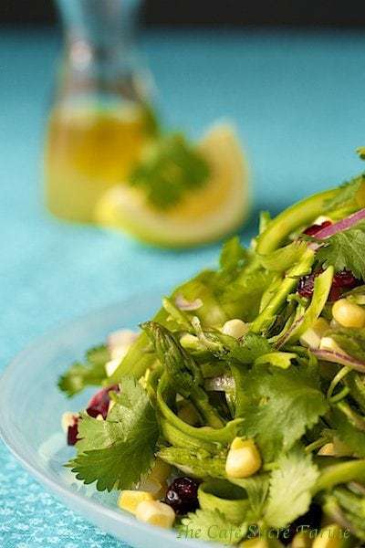- Combine asparagus/onion mixture with corn and dried cranberries and cilantro leaves. Add dressing to coat and toss well to combine.