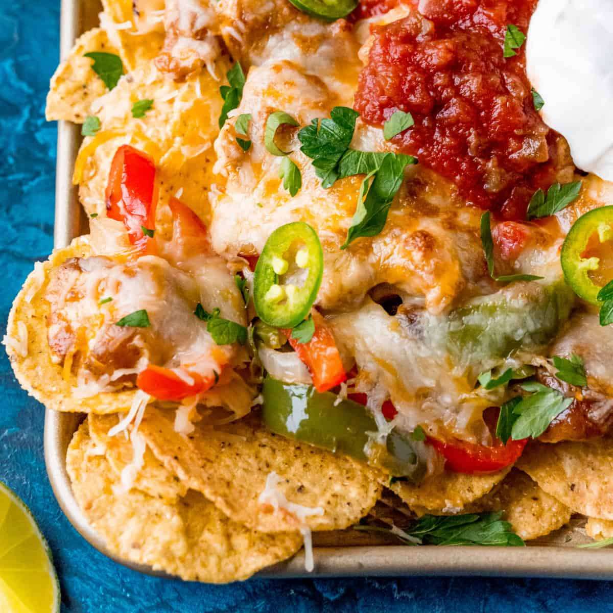 These Sheet Pan Chicken Fajita Nachos are made with a traditional fajita mixture piled on a layer of tortilla chips, then topped with melted cheese and loaded with other nacho toppings. A family favorite meal or a delicious appetizer for game day.