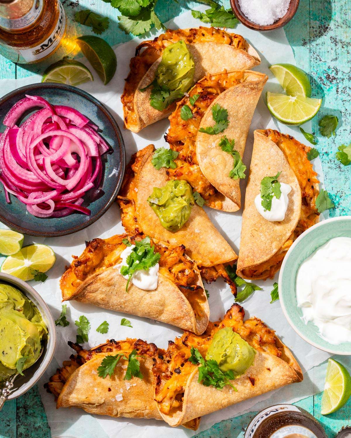 - Bake for 15-20 minutes, being careful not to burn the tortillas, flipping the tacos halfway through baking time for even browning. Serve with desired toppings like guacamole, sour cream, cilantro, pickled red onions, and salsa.