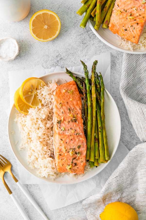 This sheet pan lemon salmon is the perfect quick and easy weeknight meal. It combines delicious salmon cooked up with asparagus, brushed with a garlic lemon butter sauce, and seasoned with fresh thyme. This recipe is light, bright, and delicious!