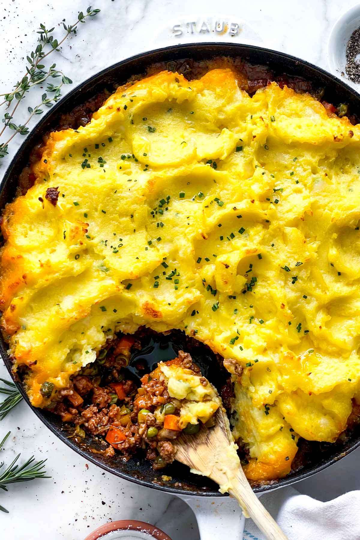 This traditional shepherd's pie recipe is made with a savory ground beef and veggie filling and topped with fluffy, buttery, cheesy mashed potatoes is the ultimate Irish comfort food dinner.