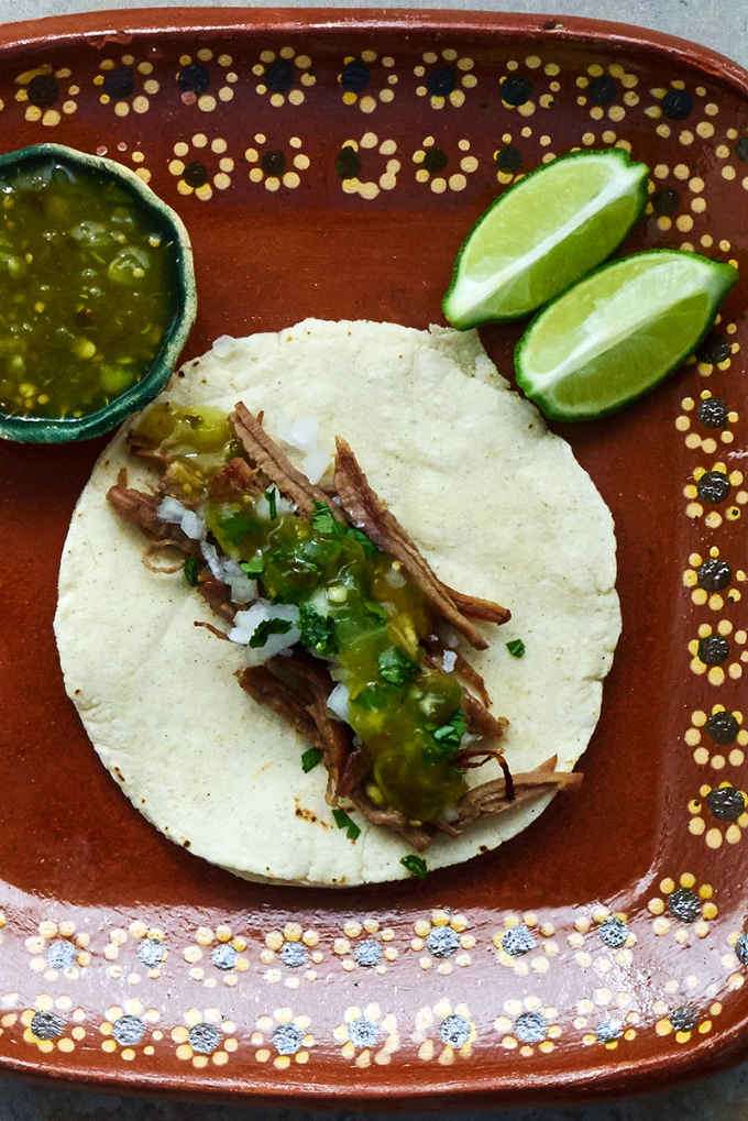 Authentic taquería style shredded beef tacos on corn tortillas garnished with finely chopped onion, cilantro, lime juice, and salsa verde or your favorite homemade salsa.