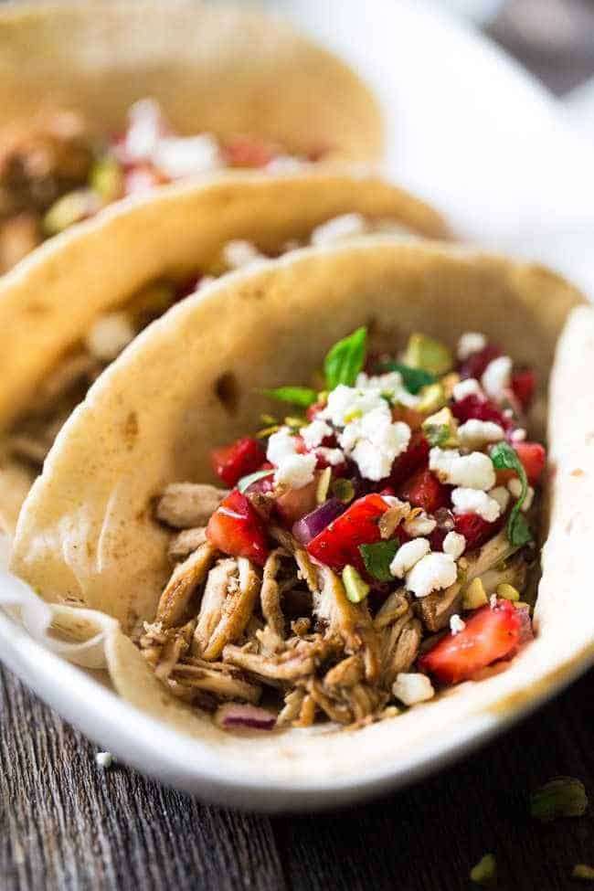 Shredded Chicken Tacos With Balsamic-Strawberry Salsa {Whole-Wheat. High Protein + Super Simple}