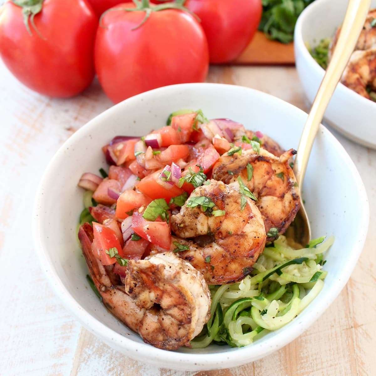 Delicious Italian marinated grilled shrimp is topped with homemade tomato basil bruschetta and served over sautéed zucchini noodles in this healthy, Whole 30 and gluten free Shrimp Bruschetta Zoodle Bowl recipe!