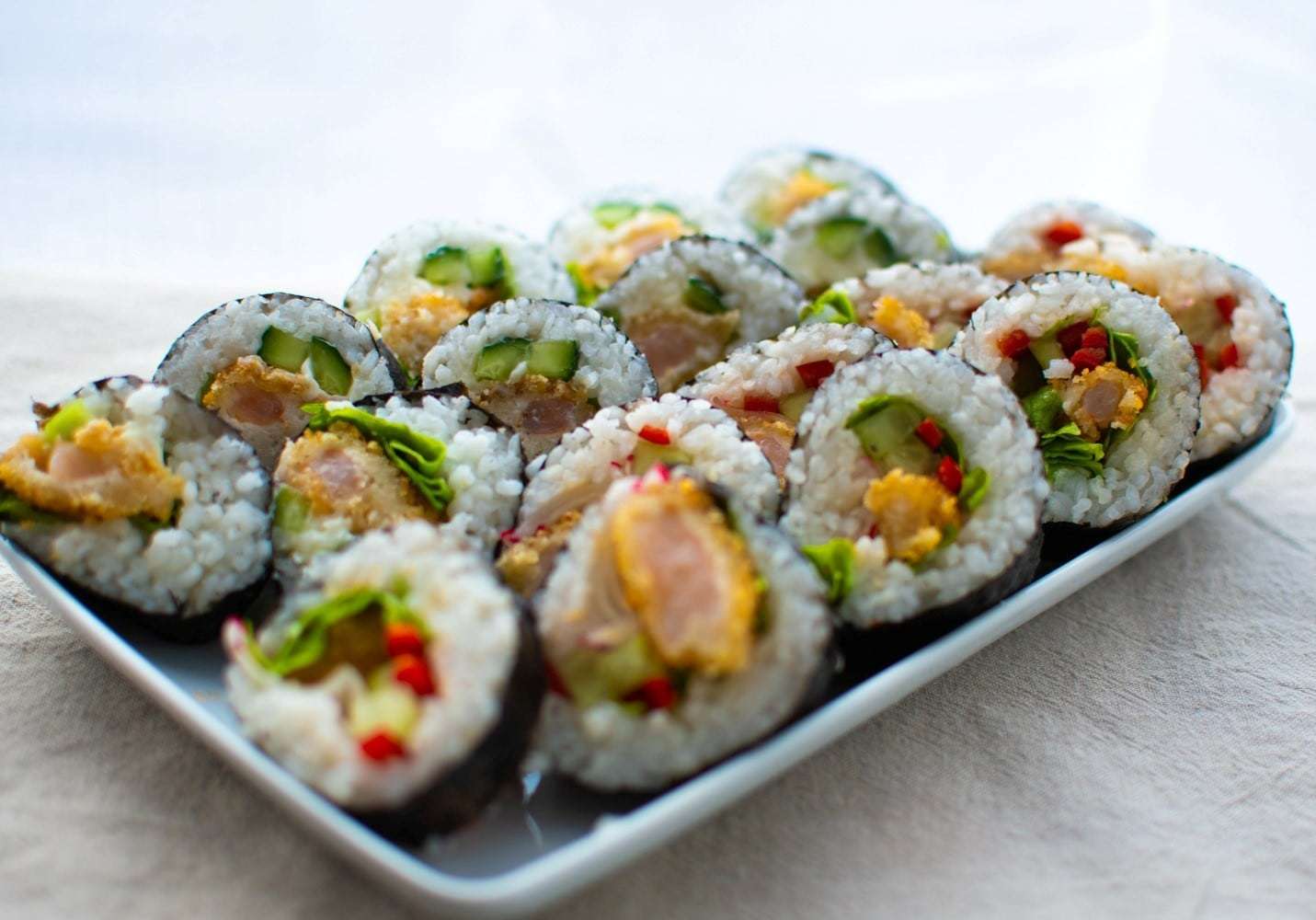 - Add the shrimp, chopped vegetables, and some finely chopped lettuce greens, inside, then roll the kimbap tightly with the bamboo mat.