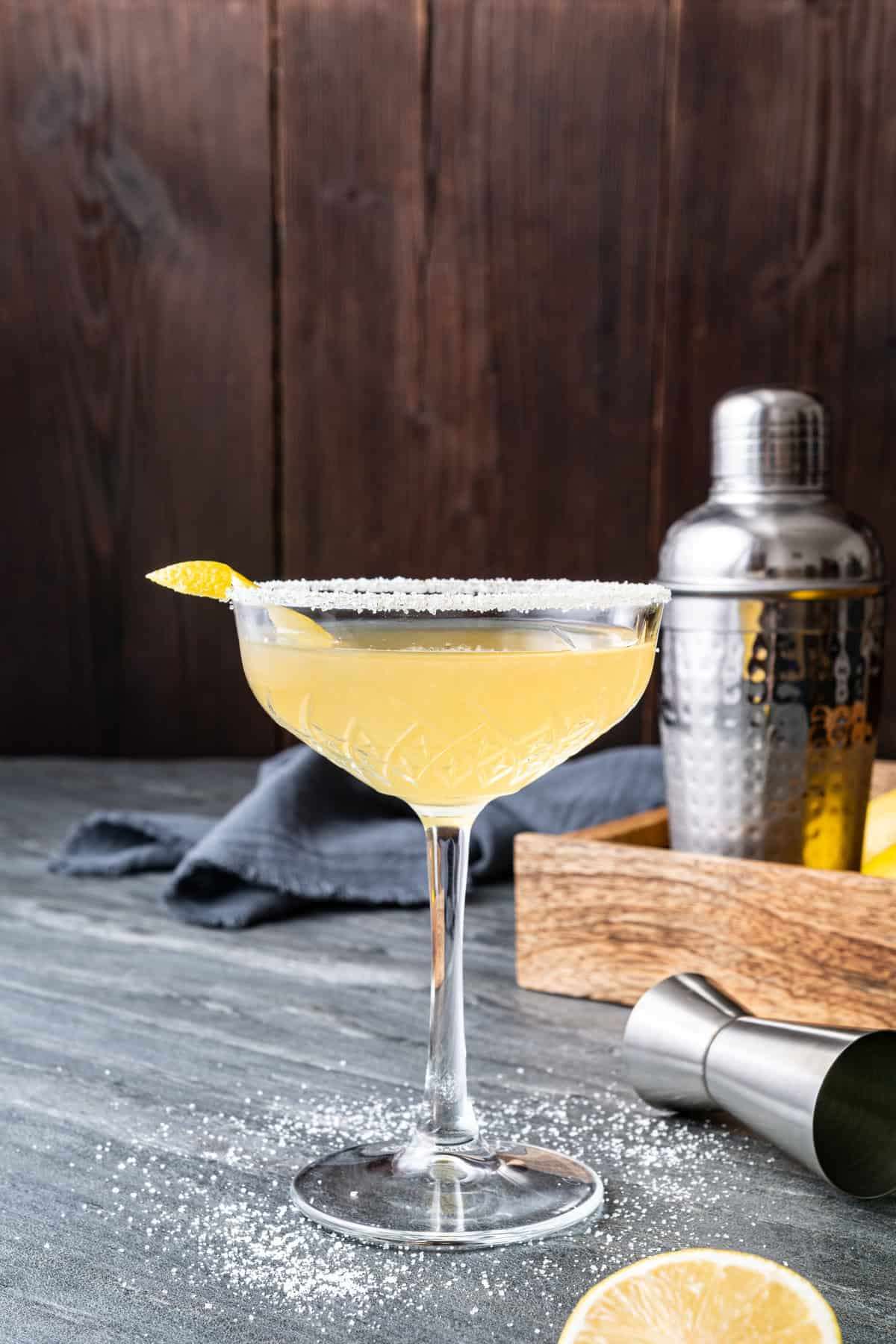 - Strain the mixture into your prepared cocktail glass. Garnish with a lemon twist.